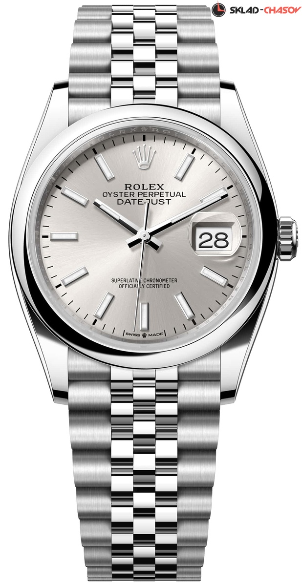 Модель 126200-0001 на браслете со звеньями в 5 рядов из материала Oystersteel - высокосортная сталь марки 904L. Гибкий и удобный браслет Jubilee был разработан специально для модели Oyster Perpetual Datejust, созданной в 1945 году к 40-летнему юбилею Rolex. Раскладывающаяся застежка с запатентованной системой быстрого удлинения Easylink. Она скрыта под застежкой и позволяет без дополнительных инструментов регулировать длину браслета примерно на 5 мм за счет дополнительного звена, которое легко складывается и раскладывается.