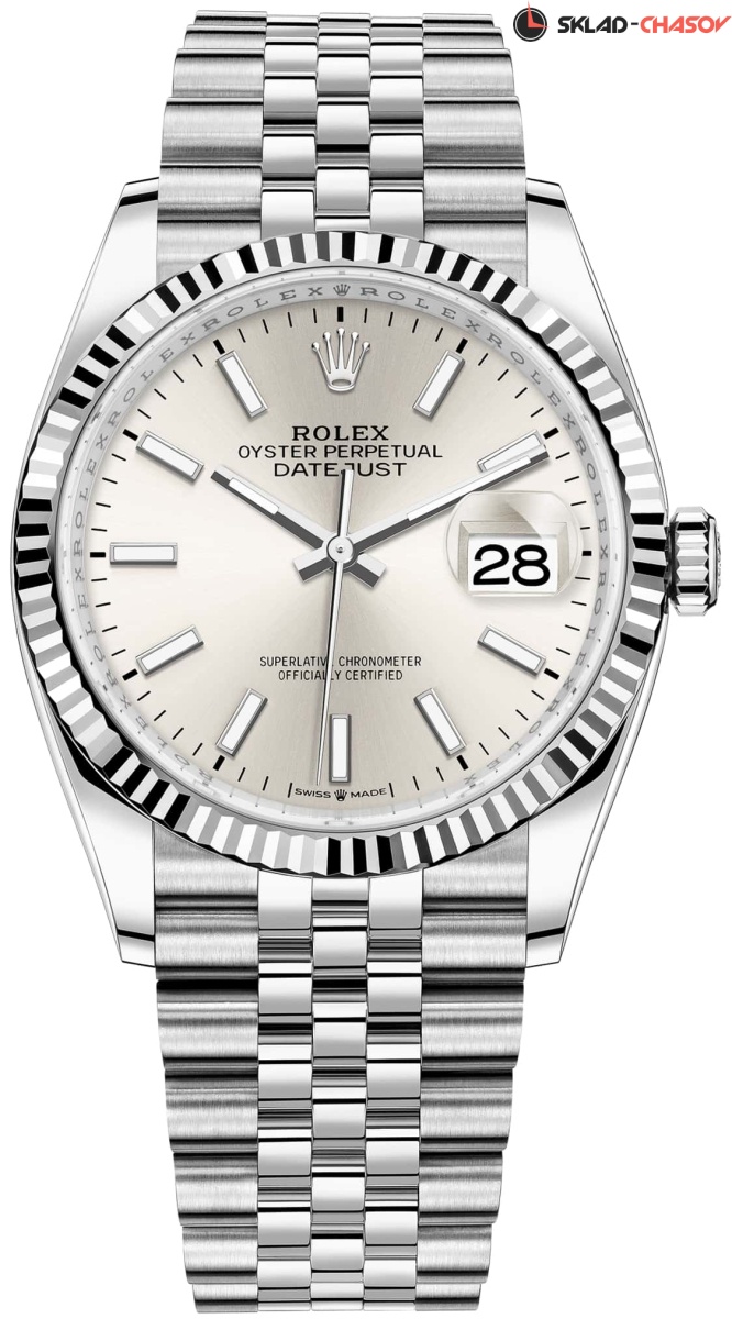Модель 126234-0013 на браслете со звеньями в 5 рядов из материала Oystersteel - высокосортная сталь марки 904L. Гибкий и удобный браслет Jubilee был разработан специально для модели Oyster Perpetual Datejust, созданной в 1945 году к 40-летнему юбилею Rolex. Раскладывающаяся застежка с запатентованной системой быстрого удлинения Easylink. Она скрыта под застежкой и позволяет без дополнительных инструментов регулировать длину браслета примерно на 5 мм за счет дополнительного звена, которое легко складывается и раскладывается.