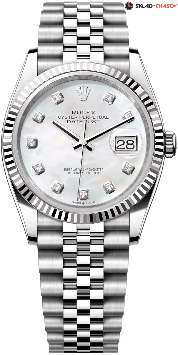 Модель 126234-0019 на браслете со звеньями в 5 рядов из материала Oystersteel - высокосортная сталь марки 904L. Гибкий и удобный браслет Jubilee был разработан специально для модели Oyster Perpetual Datejust, созданной в 1945 году к 40-летнему юбилею Rolex. Раскладывающаяся застежка с запатентованной системой быстрого удлинения Easylink. Она скрыта под застежкой и позволяет без дополнительных инструментов регулировать длину браслета примерно на 5 мм за счет дополнительного звена, которое легко складывается и раскладывается.