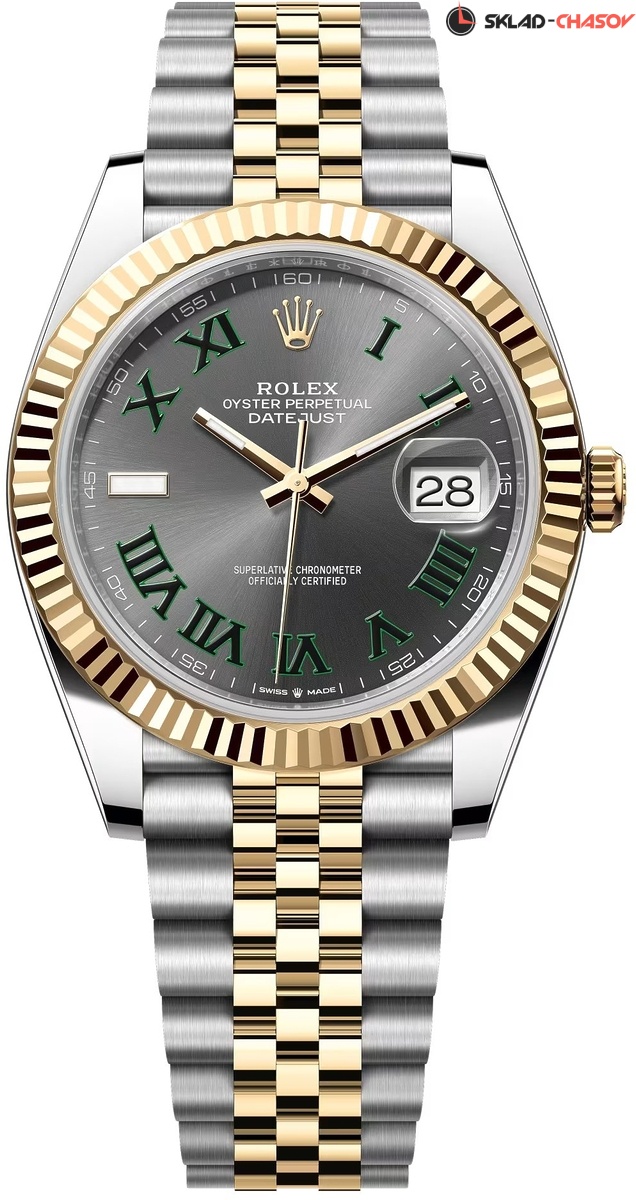 Циферблат с эффектом солнечного перелива, который достигается мастерами марки благодаря технике сатинирования. Бороздки, идущие радиально, равномерно распределяют свет создавая характерный мягкий блеск, меняющийся в зависимости от положения часов на запястье. Темно-серый цвет циферблату придается благодаря технике PVD. Завершает отделку циферблата легкая лакировка. Рисованные эмалью римские цифры черно-зеленой расцветки в стиле Wimbledon. Аппликация часовых индексов и эмблемы марки с драгоценным покрытием и полировкой. Люминесцентное вещество Chromalight с длительным свечением в темноте, запатентованное компанией Rolex, на часовых индексах и стрелках.
