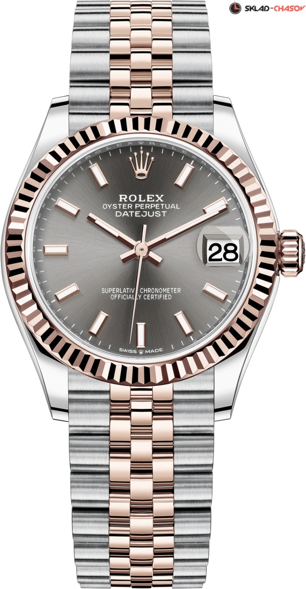 Модель 278271-0018 на браслете со звеньями в 5 рядов из материала Rolesor - золото Everose 18К и Oystersteel, высокосортная сталь марки 904L. Гибкий и удобный браслет Jubilee был разработан специально для модели Oyster Perpetual Datejust, созданной в 1945 году к 40-летнему юбилею Rolex. Раскладывающаяся застежка Crownclasp скрытая под браслетом.