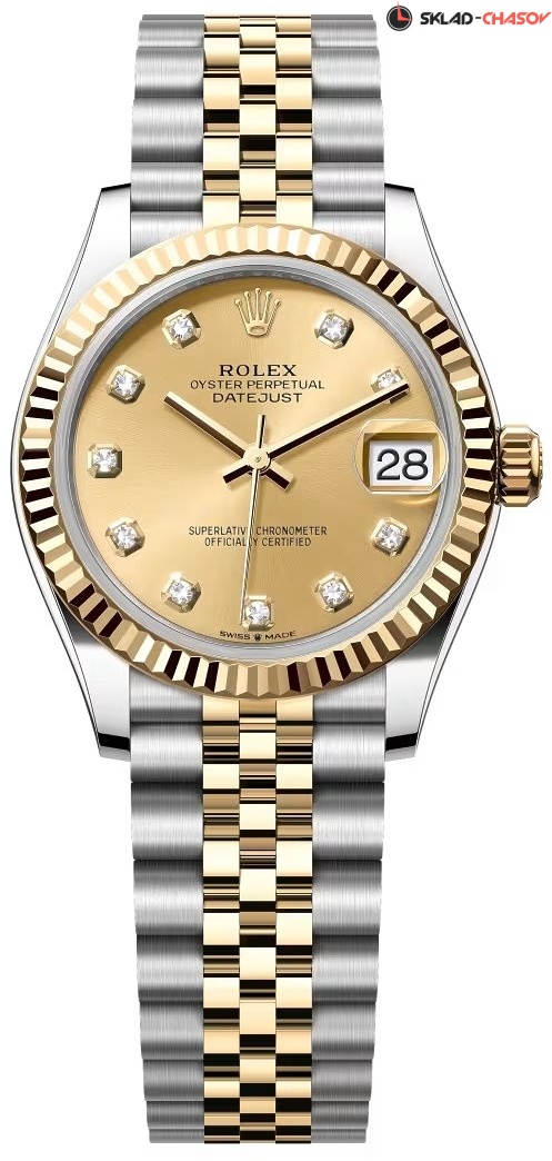Модель 278273-0026 на браслете со звеньями в 5 рядов из материала Rolesor - желтое золото 18К и Oystersteel, высокосортная сталь марки 904L. Гибкий и удобный браслет Jubilee был разработан специально для модели Oyster Perpetual Datejust, созданной в 1945 году к 40-летнему юбилею Rolex. Раскладывающаяся застежка Crownclasp скрытая под браслетом.