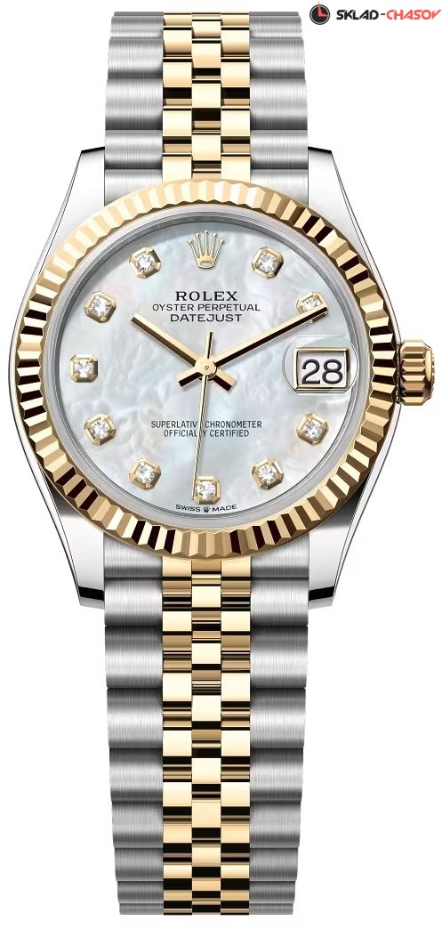 Модель 278273-0028 на браслете со звеньями в 5 рядов из материала Rolesor - желтое золото 18К и Oystersteel, высокосортная сталь марки 904L. Гибкий и удобный браслет Jubilee был разработан специально для модели Oyster Perpetual Datejust, созданной в 1945 году к 40-летнему юбилею Rolex. Раскладывающаяся застежка Crownclasp скрытая под браслетом.