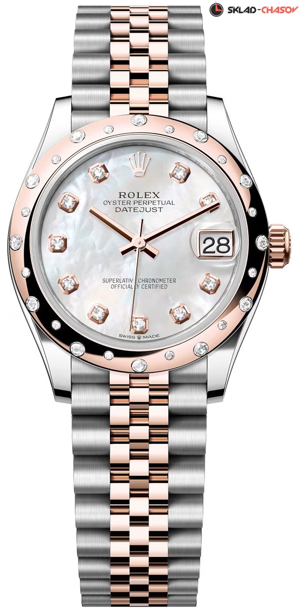 Модель 278341RBR-0026 на браслете со звеньями в 5 рядов из материала Rolesor - золото Everose 18К и Oystersteel, высокосортная сталь марки 904L. Гибкий и удобный браслет Jubilee был разработан специально для модели Oyster Perpetual Datejust, созданной в 1945 году к 40-летнему юбилею Rolex. Раскладывающаяся застежка Crownclasp скрытая под браслетом.