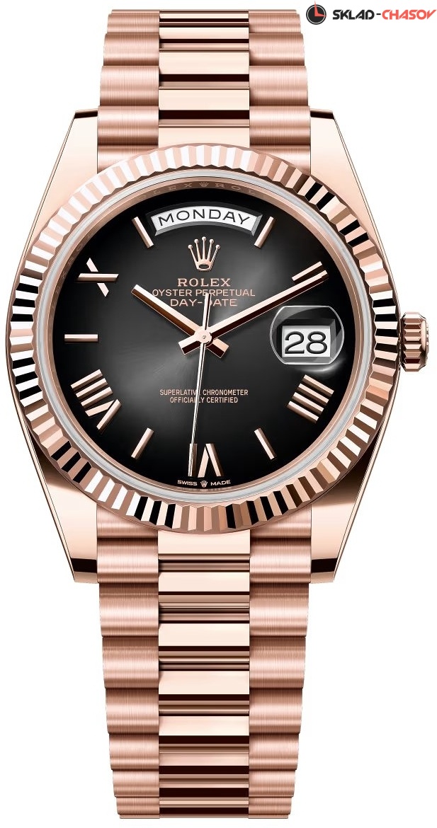 Модель 228235-0055 на браслете со звеньями в 3 ряда из золота Everose 18К. Браслет President, впервые был использован в 1956 году в модели Day‑Date. Он производится из 18‑каратного золота или платины 950 пробы и отличается идеальной симметрией, являясь эталоном классической красоты. Роскошный и удобный браслет President с полукруглыми массивными звеньями и различными видами финишной шлифовки. Скрытая застежка Crownclasp с раскладывающейся пряжкой.
