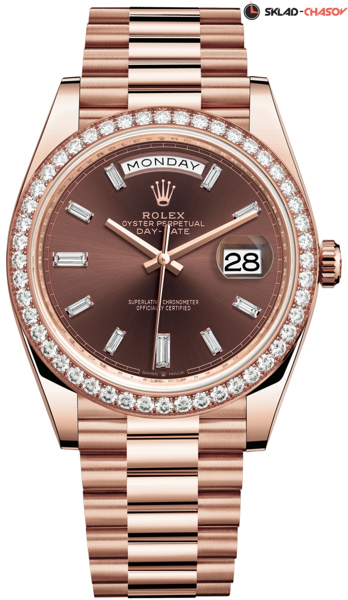 Модель 228345RBR-0006 на браслете со звеньями в 3 ряда из золота Everose 18К. Браслет President, впервые был использован в 1956 году в модели Day‑Date. Он производится из 18‑каратного золота или платины 950 пробы и отличается идеальной симметрией, являясь эталоном классической красоты. Роскошный и удобный браслет President с полукруглыми массивными звеньями и различными видами финишной шлифовки. Скрытая застежка Crownclasp с раскладывающейся пряжкой.