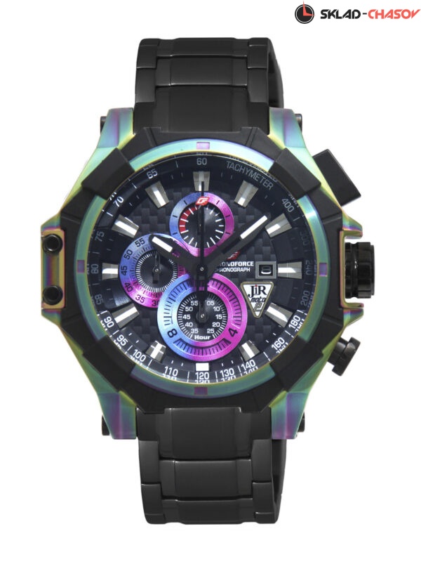 Наручные часы в спортивном стиле с хронографом отмеряют время с точностью до долей секунды (1/20 сек). Корпус нестандартной формы выполнен из нержавеющей стали AISI 304, придающей часам особую прочность и стойкость от повреждений. Его дополняет акцентная кнопка хронографа. Циферблат защищен упрочненным минеральным стеклом Hardlex. Часовая и минутная стрелки имеют люминесцентное покрытие. Браслет изготовлен из высококачественной нержавеющей стали. Подарок от бренда Chronoforce — дополнительный ремешок из приятного к телу силикона черного цвета. Улучшенный японский механизм Epson YM92. Дополнительные функции: дата.