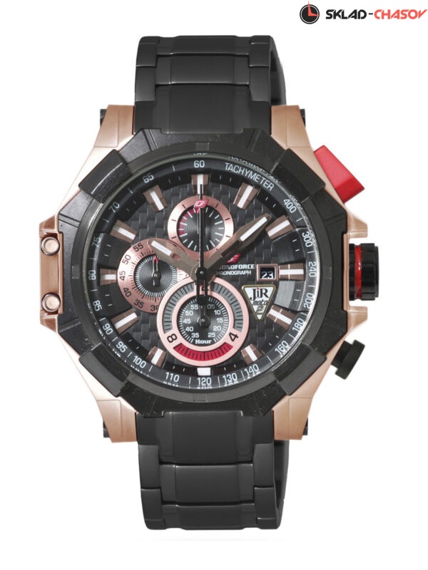 Наручные часы в спортивном стиле с хронографом отмеряют время с точностью до долей секунды (1/20 сек). Корпус нестандартной формы выполнен из нержавеющей стали AISI 304, придающей часам особую прочность и стойкость от повреждений. Его дополняет акцентная кнопка хронографа. Циферблат защищен упрочненным минеральным стеклом Hardlex. Часовая и минутная стрелки имеют люминесцентное покрытие. Браслет изготовлен из высококачественной нержавеющей стали. Подарок от бренда Chronoforce — дополнительный ремешок из приятного к телу силикона черного цвета. Улучшенный японский механизм Epson YM92. Дополнительные функции: дата.