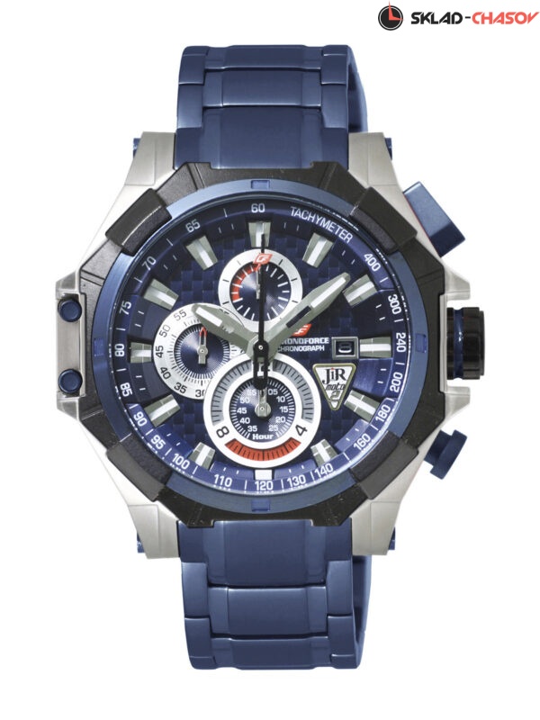Наручные часы в спортивном стиле с хронографом отмеряют время с точностью до долей секунды (1/20 сек). Корпус нестандартной формы выполнен из нержавеющей стали AISI 304, придающей часам особую прочность и стойкость от повреждений. Его дополняет акцентная кнопка хронографа. Циферблат защищен упрочненным минеральным стеклом Hardlex. Часовая и минутная стрелки имеют люминесцентное покрытие. Браслет изготовлен из высококачественной нержавеющей стали. Подарок от бренда Chronoforce — дополнительный ремешок из приятного к телу силикона черного цвета. Улучшенный японский механизм Epson YM92. Дополнительные функции: дата.
