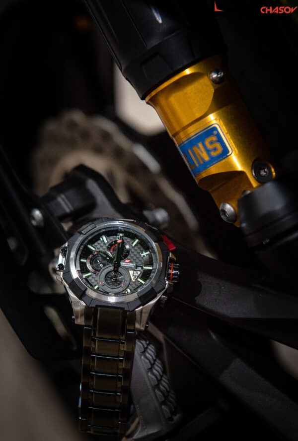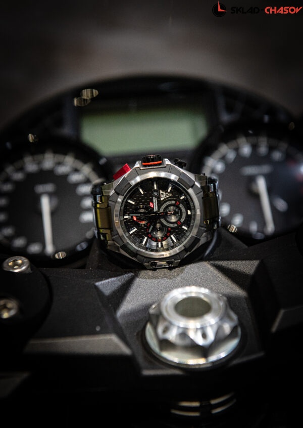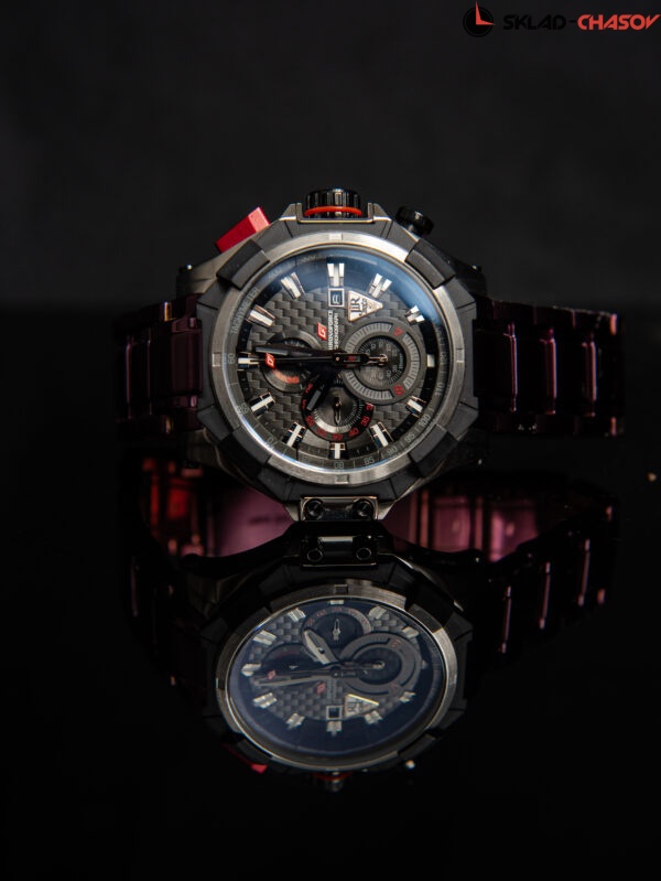 Наручные часы в спортивном стиле с хронографом отмеряют время с точностью до долей секунды (1/20 сек). Корпус нестандартной формы выполнен из нержавеющей стали AISI 304, придающей часам особую прочность и стойкость от повреждений. Его дополняет акцентная кнопка хронографа. Циферблат защищен упрочненным минеральным стеклом Hardlex. Часовая и минутная стрелки имеют люминесцентное покрытие. Браслет изготовлен из высококачественной нержавеющей стали. Подарок от бренда Chronoforce — дополнительный ремешок из приятного к телу силикона черного цвета. Улучшенный японский механизм Epson YM92. Дополнительные функции: дата.