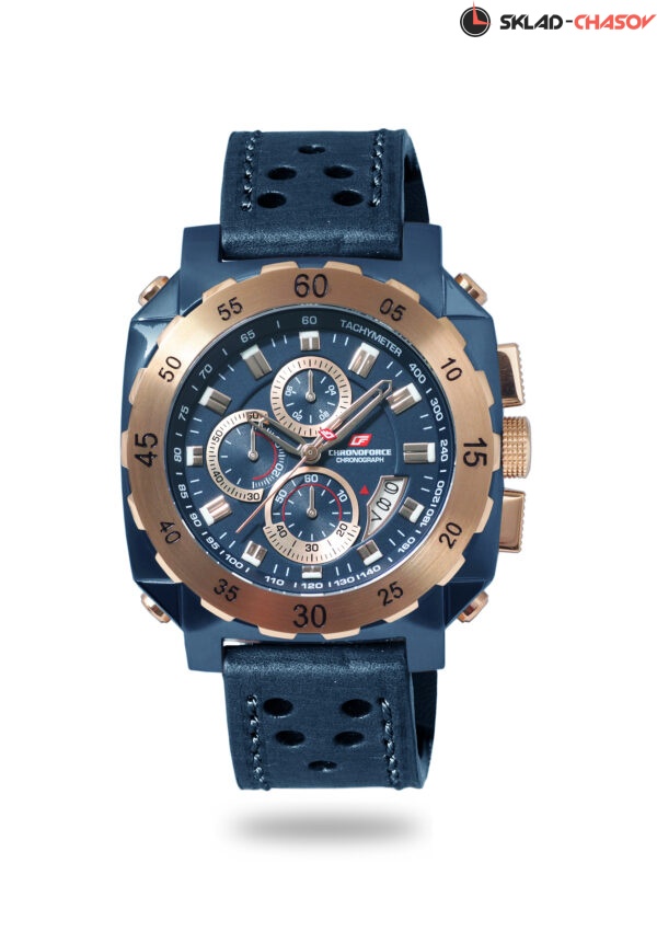 Спортивные наручные часы с хронографом отмеряют время с точностью до долей секунд (1/10 сек, 1 сек, 60 мин) и имеют тахиметрическую шкалу. Корпус выполнен из нержавеющей стали AISI 304, придающей часам особую прочность и стойкость от повреждений. Его дополняет яркий рифленный безель с числовыми отметками. Циферблат защищен упрочненным минеральным стеклом Hardlex. Ремешок из натуральной кожи с перфорацией защищает кисть от запотевания, а широкий тренчик надежно зафиксирует его кончик. Дополнительные функции: дата.