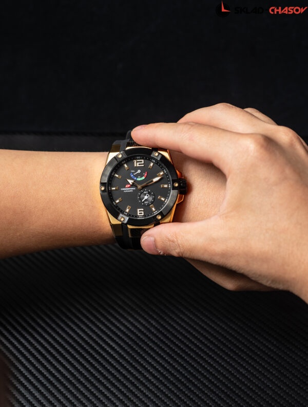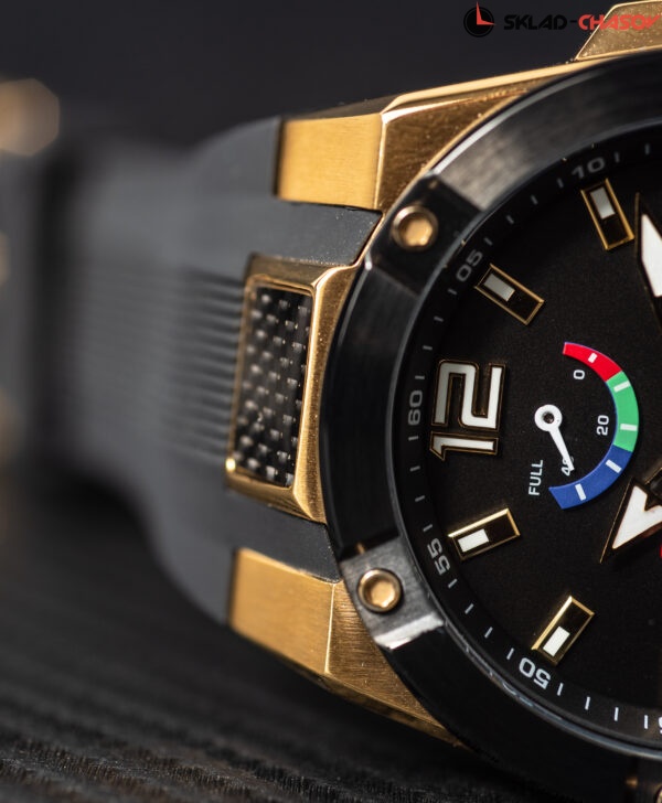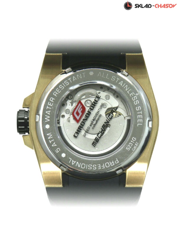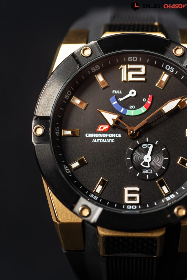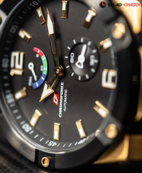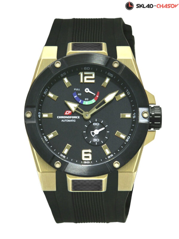 Автоматическая коллекция часов от бренда Chronoforce с акцентным элементом на циферблате в виде спидометра. Корпус выполнен из нержавеющей стали AISI 304, придающей часам особую прочность и стойкость от повреждений. Циферблат защищен упрочненным минеральным стеклом Hardlex. Часовая и минутная стрелки, а также индексы имеют люминесцентное покрытие. Ремешок изготовлен из мягкого и приятного к телу силикона. Дополнительный черный силиконовый ремешок — в подарок.