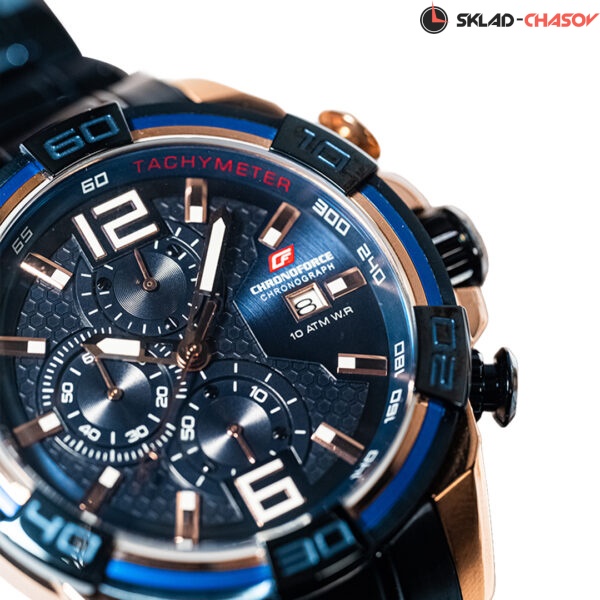 Спотивные наручные часы с хронографом отмеряют время с точностью до долей секунды (1/10 сек, 1 сек, 60 мин). Корпус выполнен из нержавеющей стали AISI 304, придающей часам особую прочность и стойкость от повреждений. Его дополняет акцентный синий безель. Циферблат защищен упрочненным минеральным стеклом Hardlex. Часовая и минутная стрелки имеют люминесцентное покрытие. Контрастный браслет изготовлен из высококачественной нержавеющей стали. Дополнительные функции: дата.