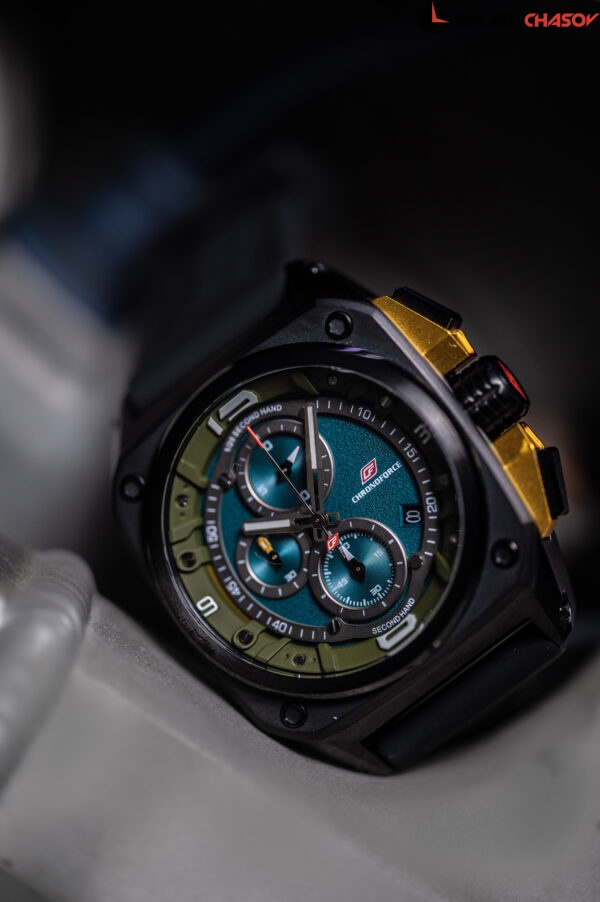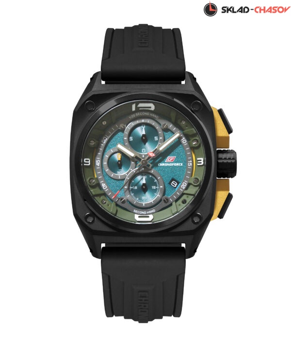 Спортивные наручные часы с хронографом отмеряют время с точностью до долей секунд (1/10 сек, 1 сек, 60 мин). Корпус выполнен из нержавеющей стали AISI 304, придающей часам особую прочность и стойкость от повреждений. Его дополняют кнопки счетчиков нестандартной формы. Циферблат защищен упрочненным минеральным стеклом Hardlex. Часовая и минутная стрелки имеют люминесцентное покрытие. Ремешок изготовлен из мягкого и приятного к телу силикона. Приятный бонус от бренда Chronoforce — дополнительный гладкий ремешок из силикона черного цвета. Дополнительные функции: дата.
