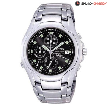 Корпус и браслет из титана, часы, минуты, секунды, индикация числа, секундомер, будильник, люминесцентные стрелки и метки, диаметр 40 мм.