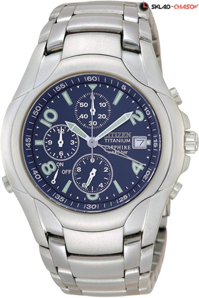 Корпус и браслет из титана, часы, минуты, секунды, индикация числа, секундомер, будильник, люминесцентные стрелки и метки, диаметр 40 мм.