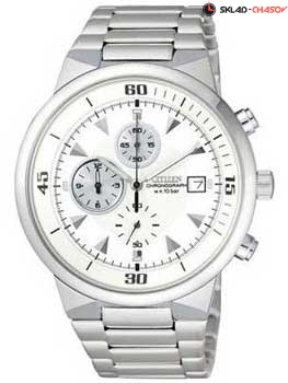 Корпус и браслет из нержавеющей стали, часы, минуты, секунды, индикация числа, секундомер, люминесцентные стрелки, диаметр 36 мм.