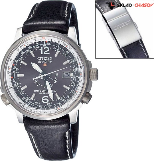 Система Eco-Drive не требующая замены батарейки. Питание от солнечной энергии, запас энергии на 180 дней. Функция быстрого старта. Автоматическая настройка времени по радиосигналу. Логарифмическая линейка. Вращающийся безель. Завинчивающаяся заводная головка.
