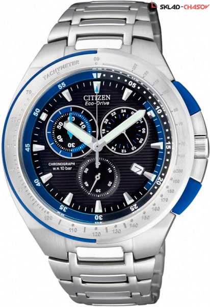 Уникальная система подзарядки от солнечного света Eco-Drive. Люминесцентные стрелки. Индикация числа. 12-ти и 24-х часовой формат времени. Секундомер.