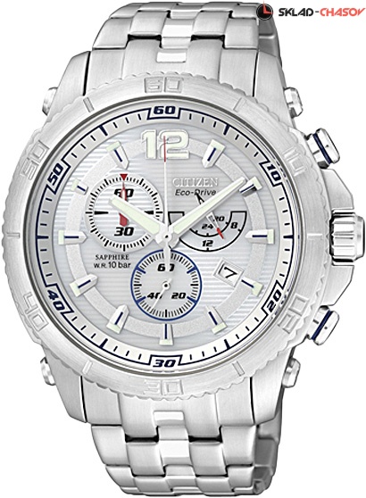 Часы-хронограф с секундомером. Система Eco-Drive не требующая замены батарейки. Питание от солнечной энергии, запас энергии на 150 дней. Система предупреждения о низком уровне заряда аккумулятора за 120 часов до критического уровня. 12-ти и 24-х часовой формат времени. Застежка с защитой от самопроизвольного раскрывания.