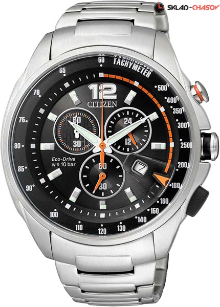 Часы-хронограф с секундомером до 60 мин, точностью 1 сек и тахиметром. Система Eco-Drive не требующая замены батарейки. Питание от солнечной энергии, запас энергии на 150 дней. Система предупреждения о низком уровне заряда аккумулятора за 120 часов до критического уровня. 12-ти и 24-х часовой формат времени. Застежка с защитой от самопроизвольного раскрывания. Окошко даты с увеличительным стеклом. На задней крышке гравировка Eco-Drive.