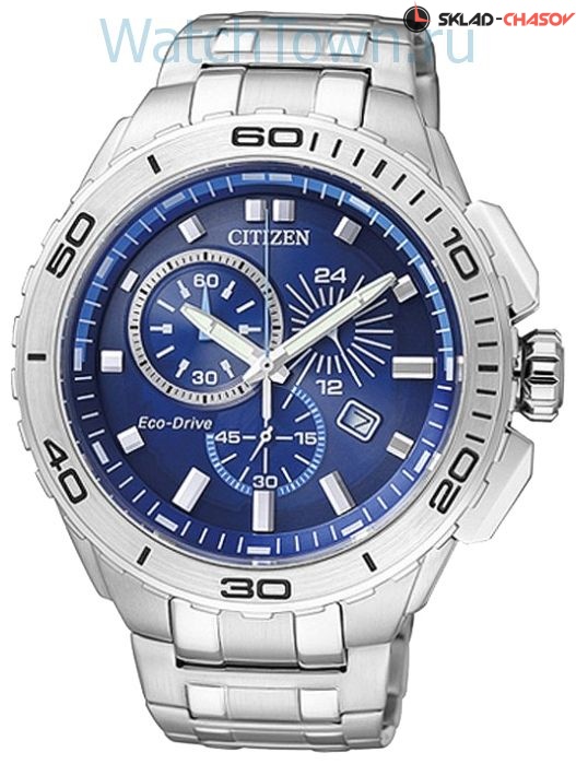 Система Eco-Drive не требующая замены батарейки. Аккумулятор подзаряжается от фотоэлемента, принимающего солнечный свет, запас энергии на 150 дней. Кварцевый хронограф с секундомером до 60 мин, точностью 1 сек. 12/24-х часовой формат времени. Индикация числа. Люминесцентные стрелки и метки. Завинчивающаяся задняя крышка. Браслет из нержавеющей стали, застежка с защитой от самопроизвольного раскрывания. Диаметр корпуса 43 мм, толщина 12 мм.