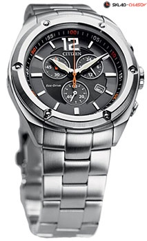 Уникальная система подзарядки от солнечного света Eco-Drive. Индикация числа. 12-ти и 24-х часовой формат времени. Секундомер. Люминесцентные стрелки. Диаметр корпуса часов 42 мм.