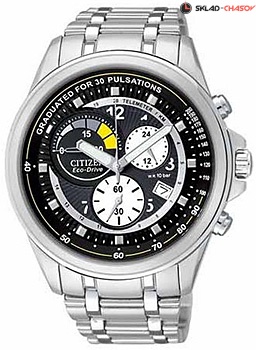 ECO DRIVE. Секундомер. Индикация числа. Тахиметр. Система Eco-Drive не требующая замены батарейки. Аккумулятор подзаряжается от фотоэлемента, принимающего солнечный свет. Средний срок службы аккумулятора 8-10 лет, после чего требуется замена аккумулятора. При полной зарядке аккумулятора часы могут пролежать в полной темноте до 5 месяцев, сохраняя запас энергии. Допустимая точность хода +/- 15 сек. в месяц.