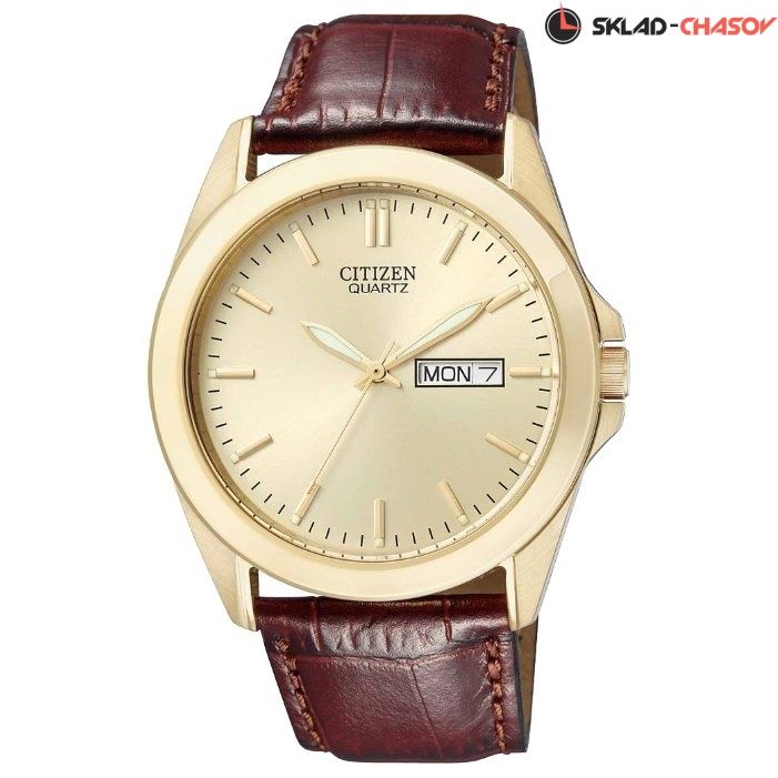 Кварцевые часы. Калибр 1102. 12 часовой формат времени. Индикатор числа и дня недели. Заводная головка с защитой. Люминесцентные стрелки и метки. Корпус из нержавеющей стали с PVD покрытием цвета золота. Минеральное стекло. Кожаный ремень. Диаметр 41 мм.