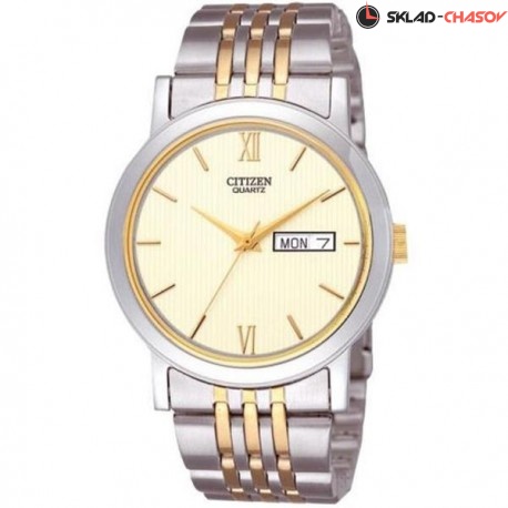Часы, минуты, секунды. Индикация числа и дня недели. Корпус и браслет из нержавеющей стали с частичной позолотой. Диаметр корпуса 36 мм