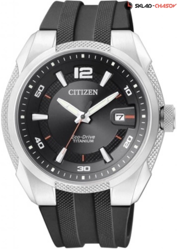 Система Eco-Drive не требующая замены батарейки. Аккумулятор подзаряжается от фотоэлемента, принимающего солнечный свет, запас энергии на 180 дней. Индикация числа. Завинчивающаяся задняя крышка. Люминесцентные стрелки. Ремешок из полимерного материала. Диаметр корпуса 42 мм, толщина 10 мм.
