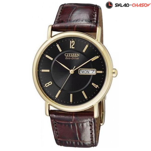 Кварцевые часы. 12 часовой формат времени. Индикатор числа и дня недели. Система ECO-DRIVE. Корпус из нержавеющей стали с PVD покрытием цвета золота. Минеральное стекло. Кожаный ремень. Диаметр 36 мм.