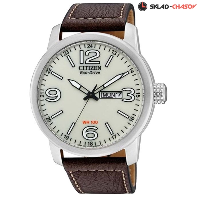 Кварцевые часы. 12 часовой формат времени. Индикатор числа и дня недели. Система ECO-DRIVE. Люминесцентные стрелки. Корпус из нержавеющей стали. Минеральное стекло. Кожаный ремень. Диаметр 42 мм.