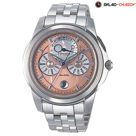 Уникальная система подзарядки от солнечного света Eco-Drive. Система предупреждения о низком уровне заряда аккумулятора за 120 часов до критического уровня. Индикация числа, дня недели, месяца. Фазы Луны. Корпус и браслет выполнены из нержавеющей стали. Диаметр корпуса часов 44 мм.