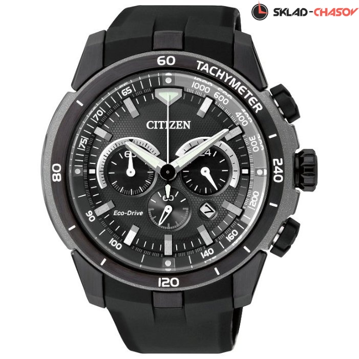 Кварцевый хронограф. Система Eco-Drive не требующая замены батарейки. Питание от солнечной энергии, запас энергии на 270 дней. Функция индикации заряда (EOL). Секундомер. 12/24-х часовой формат времени. Индикатор числа. Люминесцентные стрелки и метки. Браслет с раскладывающейся застежкой. Застежка с системой блокировки. Корпус из нержавеющей стали с IP покрытием. Минеральное стекло. Каучуковый ремень. Диаметр 48 мм.