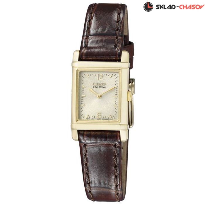 производитель citizen, тип механизма кварцевые, способ отображения времени аналоговый (стрелки), цифры арабские, формат времени 12 часов, источник энергии от солнечной батареи, форма прямоугольник, тип женские, класс водонепроницаемости wr30 (3 атм), ширина 17 мм, толщина 6 мм, материал корпуса нерж. сталь, материал браслета/ремешка кожа, стекло минеральное, дополнительная информация позолота 5 мкм, современный дизайн