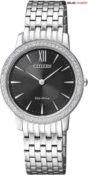 Классический дизайн и эффектное исполнение подчеркиваются сочетанием контрастных отделок и блеском кристаллов. Система Eco-Drive, не требующая замены батарейки. Питание от солнечной энергии, запас энергии на 360 дней. Функция индикации заряда (EOL) и предотвращения перезарядки. Браслет с раскладывающейся застежкой. Застежка с системой блокировки.