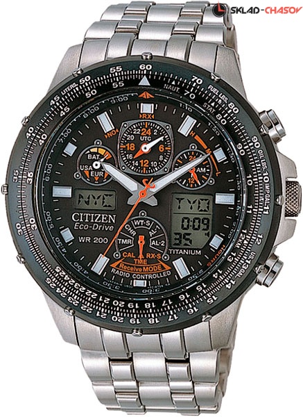 Часы-хронограф с секундомером до 24 часов и точностью 1/100сек. 12-ти и 24-х часовой формат времени. Мировое время в 43 городах. Вечный календарь. Система Eco-Drive не требующая замены батарейки. Питание от солнечной энергии, запас энергии на 180 дней. Автоматическая настройка времени и даты по радиосигналу. Система предупреждения о низком уровне заряда аккумулятора. Логарифмическая линейка. Застежка с фиксатором и гравировкой.