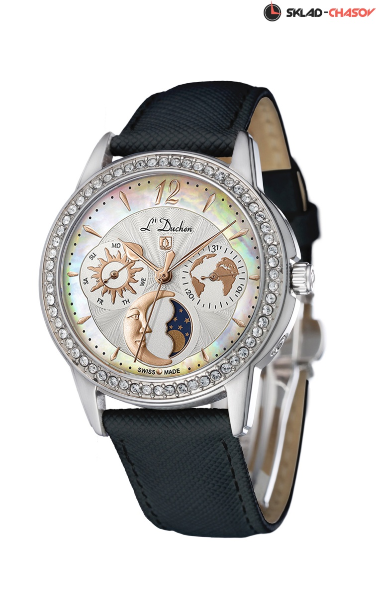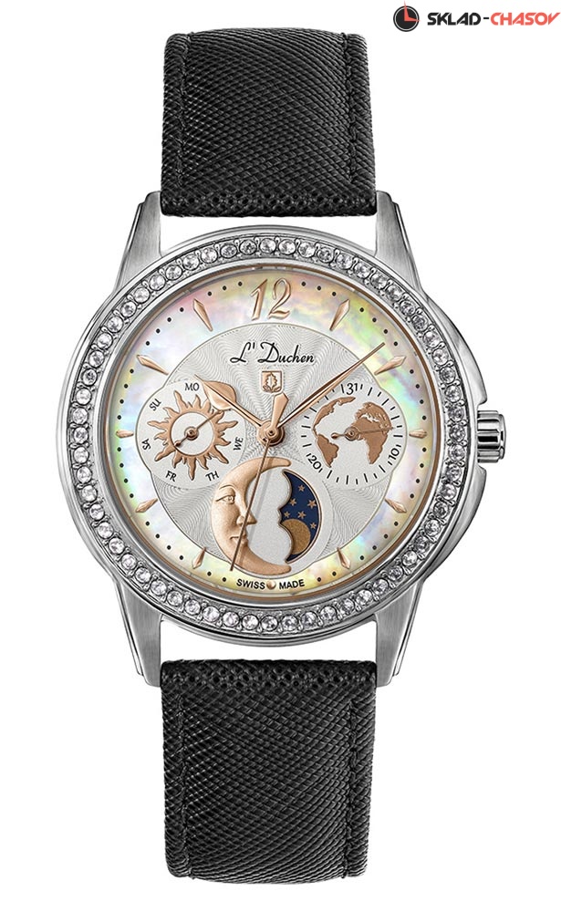 Солнце и месяц, карта нашей планеты и кольцо из натурального перламутра: все это вы найдете в многофункциональных часах серии Celeste (в пер. «Небесная»). Внутри корпуса из нержавеющей стали работает швейцарский кварцевый механизм Ronda. На безеле — нить сияющих фианитов. Гильошированный циферблат белого цвета вмещает искусно оформленные индикаторы даты, дня недели и фаз луны. Изящные стрелки, разнообразные по величине и форме, хорошо читаются. Защищает циферблат сапфировое стекло — прозрачное и стойкое к появлению микроцарапин. Для регулирования значений дня недели и даты предусмотрены отдельные кнопки. Они скрыты в корпусе — такое строение препятствует повреждению механизма в случае некорректного использования кнопки. Часы представлены на ремешке из натуральной кожи черного цвета с сафьяновым тиснением и надежной и удобной в использовании застежкой-клипсой. Часы серии Celeste станут яркой деталью любого образа: и повседневного, и вечернего.