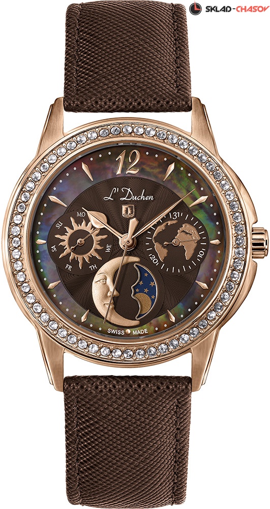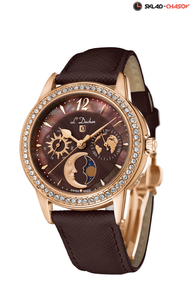 Солнце и месяц, карта нашей планеты и кольцо из натурального перламутра: все это вы найдете в многофункциональных часах серии Celeste (в пер. «Небесная»). Внутри корпуса из нержавеющей стали с PVD-покрытием из розового золота работает швейцарский кварцевый механизм Ronda. На безеле — нить сияющих фианитов. Гильошированный циферблат коричневого цвета вмещает искусно оформленные индикаторы даты, дня недели и фаз луны. Изящные стрелки, разнообразные по величине и форме, хорошо читаются. Защищает циферблат сапфировое стекло — прозрачное и стойкое к появлению микроцарапин. Для регулирования значений дня недели и даты предусмотрены отдельные кнопки. Они скрыты в корпусе — такое строение препятствует повреждению механизма в случае некорректного использования кнопки. Часы представлены на ремешке из натуральной кожи коричневого цвета с сафьяновым тиснением и надежной и удобной в использовании застежкой-клипсой. Часы серии Celeste станут яркой деталью любого образа: и повседневного, и вечернего.