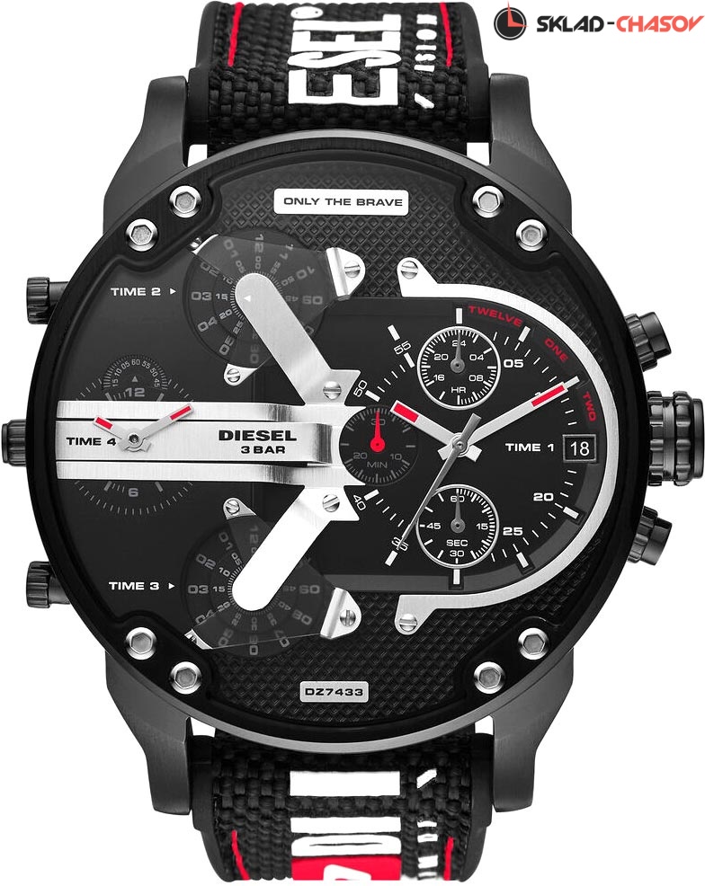 Функции нескольких часовых поясов и хронографа - часы для молодого, стильного и уверенного в себе путешественника. Эффектные многофункциональные часы Mr. Daddy 2.0. Часы-хронограф с секундомером на основном циферблате. 12-ти и 24-х часовой формат времени. Счетчики на 60 секунд и 30 минут. Четыре механизма, на двух из которых указатели часов и минут в виде вращающихся дисков, на третьем - на вращающемся диске указатель секунд. Четыре часовых пояса. Завинчивающаяся задняя крышка. Нейлоновый ремешок с надписью Diesel и классической пряжкой.