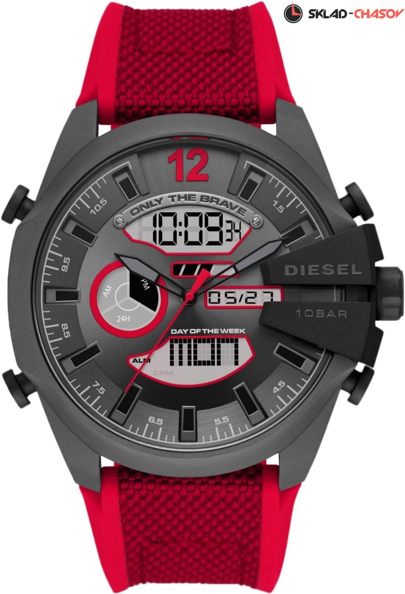 Аналогово-цифровые часы-хронограф с секундомером от Diesel. 12-ти и 24-х часовой формат времени. Заводная головка с защитой. Комбинированный ремешок из текстиля и силикона с классической застежкой.Гарантия 2 года.