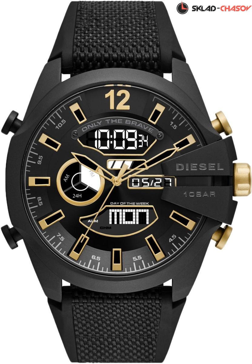 Аналогово-цифровые часы-хронограф с секундомером от Diesel. 12-ти и 24-х часовой формат времени. Заводная головка с защитой. Комбинированный ремешок из текстиля и силикона с классической застежкой.Гарантия 2 года.