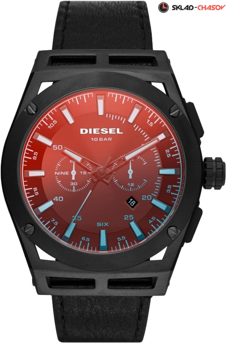 Мужские часы-хронограф от Diesel. Завинчивающаяся стальная задняя крышка. Ремешок с классической застежкой. Гарантия 2 года.