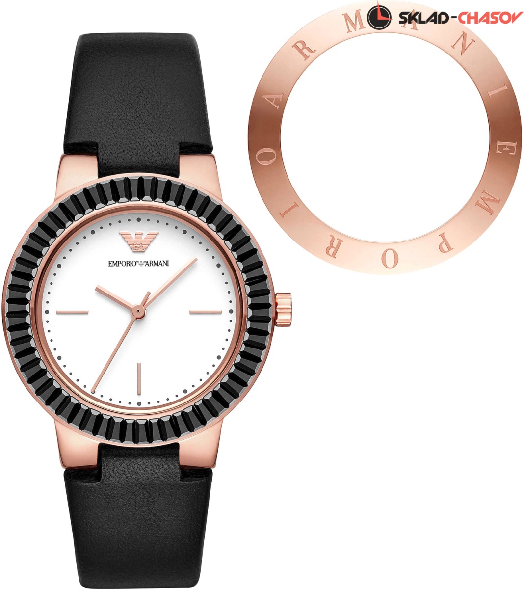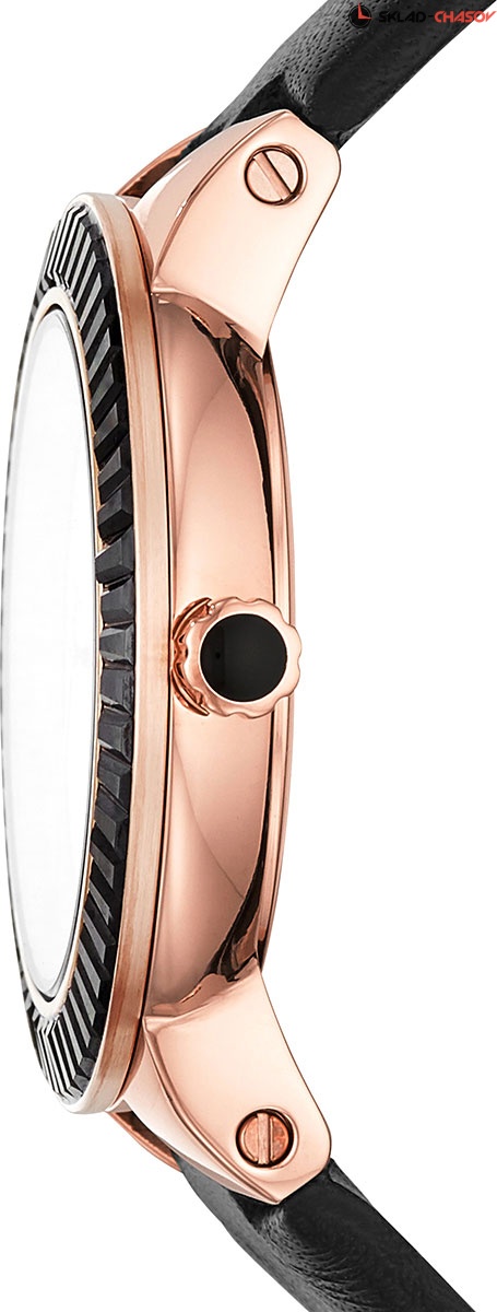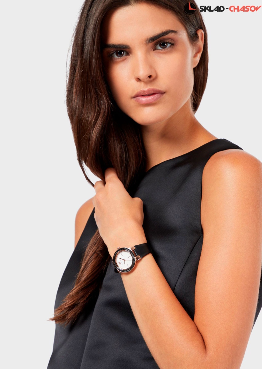Стильный и в то же время лаконичный дизайн этих часов притягивает внимание эффектными возможностями. Эти часы способны меняться под ваше настроение. Greta. Женские часы с круглым стальным корпусом и безелем украшенным черными кристаллами. В комплекте сменный безель, украшенный названием бренда. Черный кожаный ремешок с классической застежкой.