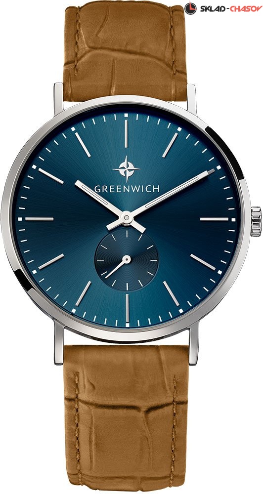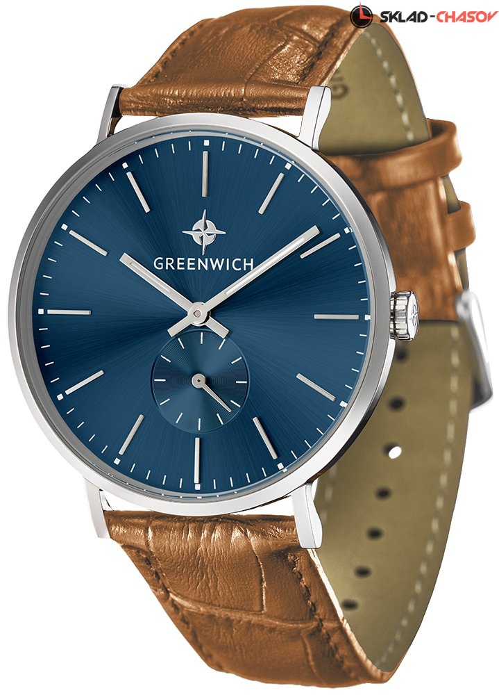 Элегантный дизайн кварцевых часов Greenwich выполнен с минимумом деталей. Круглый тонкий корпус из гипоаллергенной нержавеющей стали имеет универсальный диаметр 40 мм. Часы прекрасно подойдут любителям классики и минимализма. В центре полированного циферблата цвета морской волны — часовая и минутная стрелки. Они крупные и хорошо читаются. Секундная стрелка вынесена в нижнюю часть, с отдельной маркировкой секунд. Циферблат надежно защищен прочным минеральным стеклом. Часы установлены на плотный ремешок светло-коричневого цвета из натуральной кожи с прошивкой.