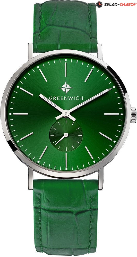 Задняя крышка часов украшена изображениями «розы ветров» и корабля, который является символом марки Greenwich.