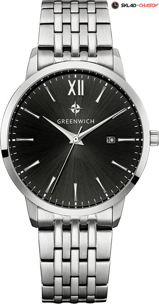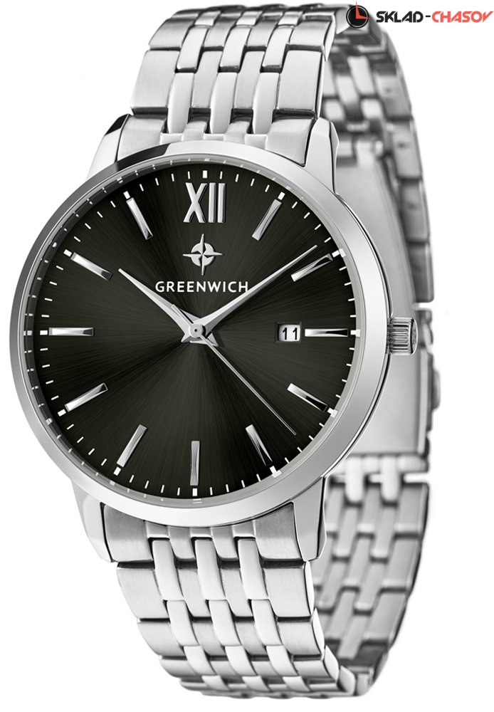 Задняя крышка часов украшена изображениями «розы ветров» и корабля, который является символом марки Greenwich.