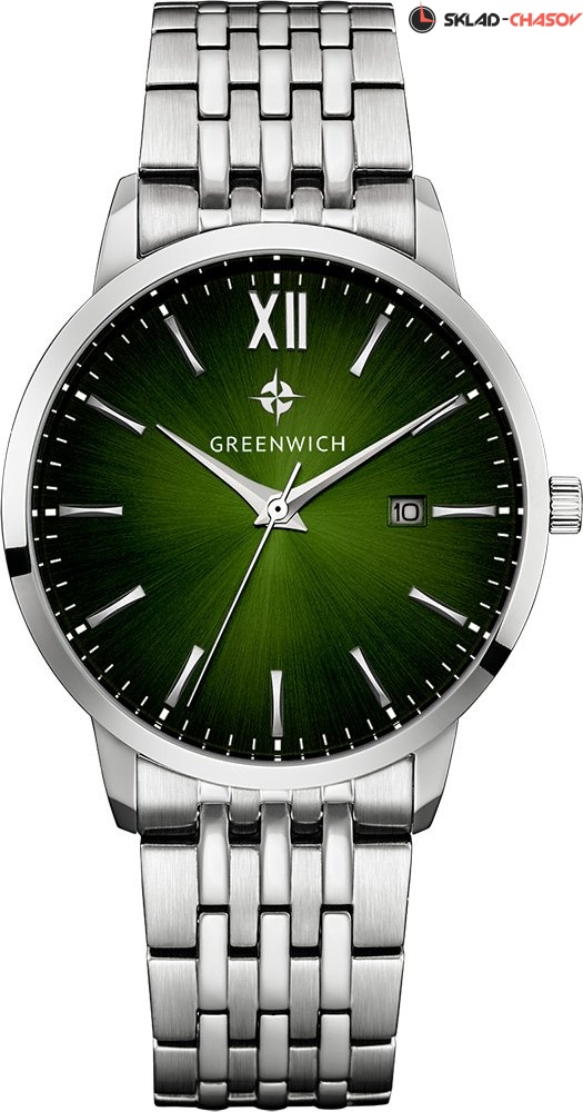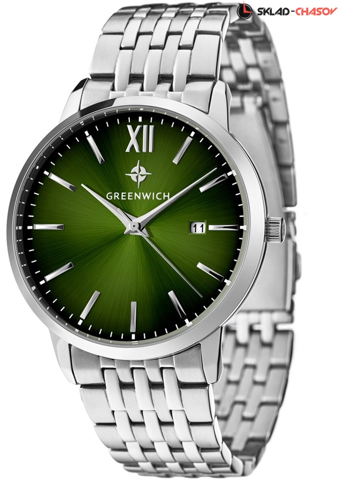 Полировка на циферблате зеленого цвета выполнена в стиле солнечных лучей. Индексы часов изготовлены вручную и закреплены на двух штифтах. Выпуклая форма рисок создает эффект игры солнечных бликов. Часовая и минутная стрелки имеют мечеобразную форму и выглядят объемными. В модели представлена дополнительная функция – дата. Окошко даты расположено на циферблате на уровне трех часов.