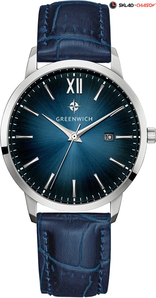 Задняя крышка часов украшена изображениями «розы ветров» и корабля, который является символом марки Greenwich.